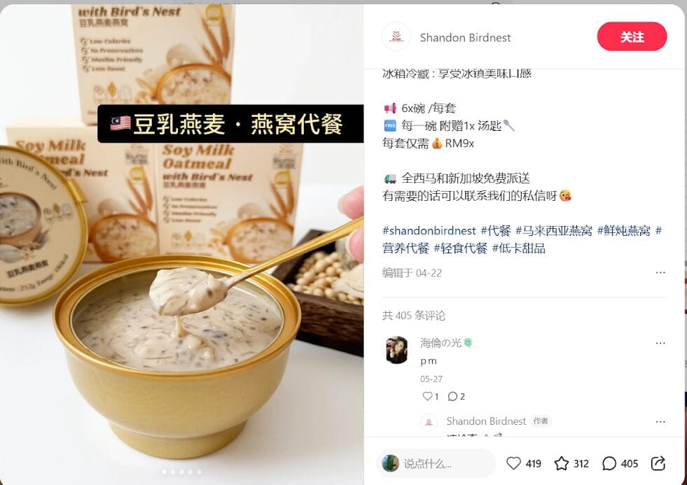 👤 Source:@Shandon Birdnest ✨ 马来西亚燕窝代餐热潮席卷2025/2026 近年来,随着健康意识提升,“燕窝代餐”在马来西亚掀起热潮。尤其是这款【豆乳燕麦燕窝】,凭借高颜值包装、真实颗粒口感与营养丰富的成分,成为不少人日常低卡饮食的首选。 这款代餐产品在小红书上引发热议,更被网友称为“全马断货王”。一碗仅186大卡,却有饱腹感,非常适合作为日常三餐的替代选择。 🍽️ 豆乳燕麦燕窝的主要成分与优势 🥣 优质食材搭配,营养全面 根据产品介绍与图示,主要原料包括: 🌡️ 高温高压灭菌技术,锁住营养 采用121°C高温高压技术,不仅确保食品安全,同时保留真实口感与营养,口感宛如现炖。 ⏱️ 灵活方便的食用方式 无论你是上班族、学生党,还是健身控,都能轻松融入生活: 每碗还附赠小汤匙,让你随时随地轻松享用。 💡 为什么选择这款代餐? ✅ 五大核心优势 🌟 适合人群 🔚...