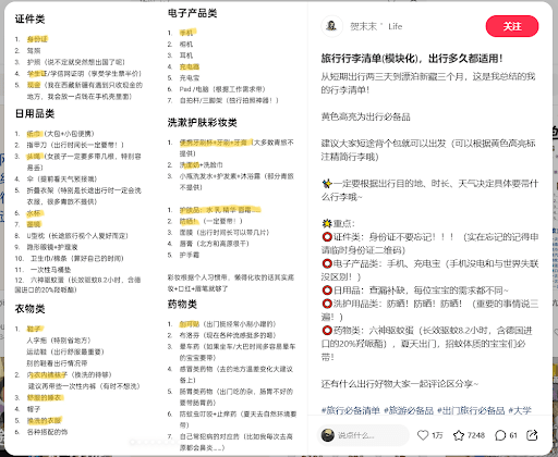📌 Credit: @贺末末'Life(小红书) 不管是两三天的城市短途游,还是三个月的拉萨远行,行李都能打得又快又稳。@贺末末'Life 总结出这份适用于大多数人群、可根据出行天数灵活调整的模块化旅行清单,并贴心标注重点必带项,省去重复思考。 ✅ 模块一览(核心分类): 1️⃣【证件类|必备】 2️⃣【电子设备类|出行连结】 3️⃣【洗护&日用品类|舒适保障】 4️⃣【药品类|健康守护】 5️⃣【服装类|轻量穿搭】 💬 用户热议:“睡衣真的被低估了!” “@森森小笼包:睡衣真的太关键!我必须带。”“@贺末末'Life 回复:我也是,穿了舒服又方便。”“@eileen:很多人不会带,结果每天穿着外衣睡超不舒服。” 📈 评论显示,“舒适感”成为旅行新刚需。尤其是睡衣、防晒、驱蚊用品等常被忽略的细节,正成为提升幸福感的隐藏神器。 在整理旅行行李时,我们总是容易陷入“什么都想带”的混乱中。博主用自己的实战经验,归纳出这份既实用又灵活的模块化打包法,让打包不再是压力,而是提前建立旅行幸福感的第一步。她强调“舒适”和“高效”,尤其提醒大家不要忽略像睡衣这类看似不起眼却极具仪式感的旅行单品。这份清单,不只是打包建议,更是一种温柔、有条理的生活方式。 When it comes to packing, it’s easy...