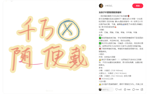 ✨ Credit: @小希日记(小红书) 年抛毁眼、含水量玄学、直径选错秒变“塑料感”…… 作为细节控,我踩过的坑不计其数😢这篇是我用6年佩戴经历整理出的新手避坑指南,涵盖从周期、材质到实际佩戴体验,收藏=省眼睛+省钱包! 🔍 五大选购关键点 1️⃣ 周期选择 ✅ 周抛/月抛:性价比最高,适合学生党/常规通勤✅ 日抛:最卫生,适合敏感眼/偶尔拍照(💰贵但值得)❌ 年抛/季抛:易滋生细菌,卫生问题频出,不建议使用 2️⃣ 直径选法 3️⃣ 含水量避雷法则 ✔️ 推荐区间:38%-45%(稳定水润)❌ 高于50%:初戴湿润,长时间反而“倒吸水分”,导致干涩 4️⃣ 透氧量(决定你戴多久会干) 5️⃣ 材质排名 🥇 硅水凝胶:高透氧+佩戴舒适,适合长期佩戴或敏感眼🥈...