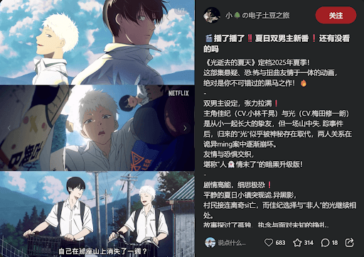 Source: @小🌳の电子土豆之旅 马来西亚2025/2026必追!Netflix悬疑动漫黑马来袭 马来西亚2025/2026年,对二次元迷来说又将是热血沸腾的一年。Netflix正式宣布,《光逝去的夏天》定档2025年夏季!这部集悬疑动漫、恐怖氛围、双男主设定于一体的黑马番剧,无疑是今年最值得关注的作品之一。 《光逝去的夏天》剧情简介:友情与恐惧交织 双男主设定引爆话题 本作围绕: 两人自小青梅竹马,却因一场山中失踪事件彻底改变命运。归来的“光”,似乎不再是原来的自己。随着诡异的命案逐步浮现,两人之间的友情、信任与恐惧交织,关系逐渐崩坏。 堪称“人情未了”的暗黑升级版,细腻刻画人心深处的孤独与执念。 悬疑动漫的高能氛围 《光逝去的夏天》在剧本上充满张力:✅ 平静的夏日小镇✅ 神秘黑影潜伏✅ 村民接连离奇死亡✅ 非人之光与佳纪的纠缠 整部剧从视觉到叙事,都极具恐怖与悬疑张力,完美展现夏日里灼热阳光与潜藏暗流的强烈反差。 马来西亚动漫迷必看!制作班底超豪华 《光逝去的夏天》由: 携手打造。 画面细腻到每一帧都暗藏隐喻: 马来西亚2025/2026观众,绝不能错过这场视觉盛宴。 《光逝去的夏天》与马来西亚动漫潮流 近年来,马来西亚动漫观众对: 的兴趣不断飙升。《光逝去的夏天》恰好满足这些要素,是2025/2026年最有潜力冲上热播榜的黑马。 不仅剧情高能,主题更触及:✅ 孤独与归属✅...
