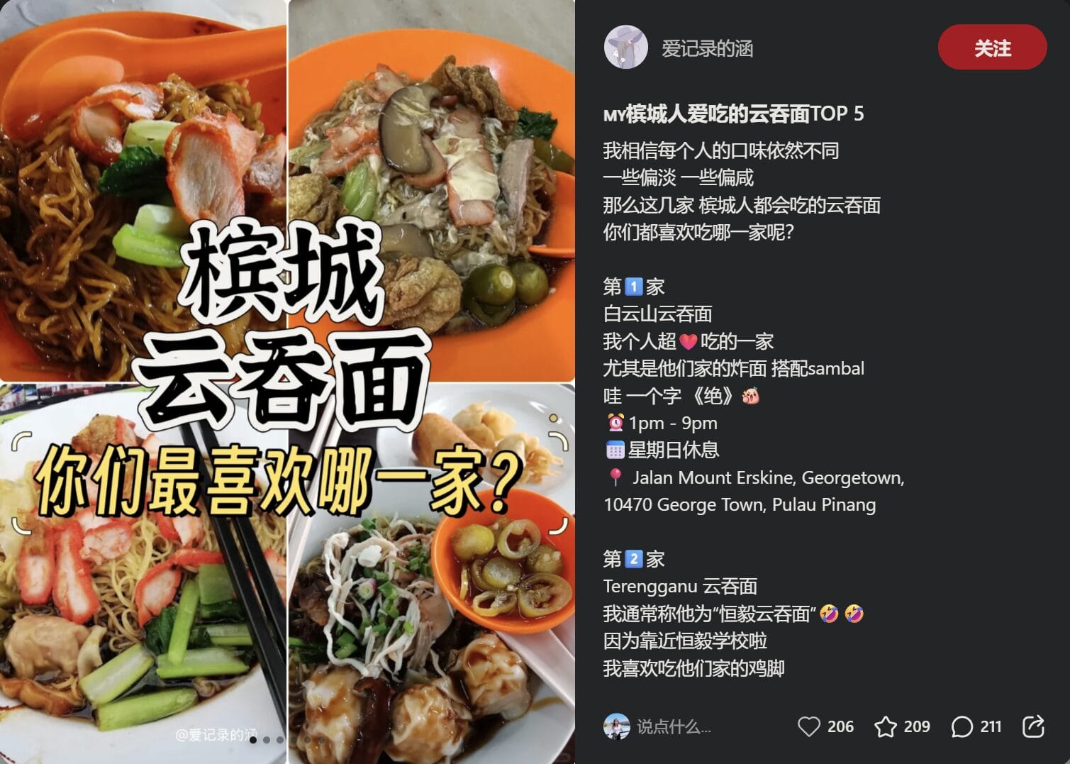 @爱记录的涵 整理了槟城在地人最爱吃的5家云吞面,无论你爱干拌、浓汁、鸡脚还是炸面,这篇绝对能找到你的心头好! 白云山云吞面|马来西亚槟城人最爱的炸面搭配sambal 这家位于 Mount Erskine 的白云山云吞面,不仅是本地人心头好,也是爱吃炸面的饕客必试之选。搭配特制 sambal 酱料,一口下去浓郁香辣,真的只有“绝”能形容! 📍 地址:Jalan Mount Erskine, Georgetown, 10470 George Town, Pulau Pinang🕐 营业时间:1pm – 9pm(星期日休息) 鸡脚党必吃!Terengganu 云吞面(恒毅云吞面) 因为靠近恒毅学校,这家常被称为“恒毅云吞面”。这里的招牌鸡脚让人欲罢不能,炖得软烂入味,搭配干捞云吞面超级搭配。 📍...