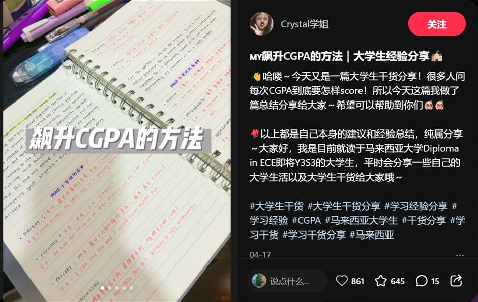 👩‍🎓 Source: @Crystal学姐 大学生们最关注的问题之一,就是如何提升CGPA。特别是在马来西亚的高校中,课程内容密集,考试频率高,很多学生都感到吃力。这篇文章将根据 @Crystal学姐 分享的干货笔记,结合课堂表现、作业安排、期末考试和笔记整理四大维度,为你系统整理提升CGPA的实用方法! 📚 上课表现是提升CGPA的基础 课上学习是取得高分的第一步。学姐建议从这三方面入手: 🎯 提前预习,带着问题听课 提前阅读课程内容并标记不理解之处,有助于课堂上集中听重点。 🧠 专心听讲,积极互动 紧跟老师思路,回答问题能提升印象分,也加深理解。 📝 做好笔记,课后补充 使用缩写和符号简化记录,整理出重点内容和公式,有助于日后复习。 🗂 Assignment也能拉高成绩 课业分数同样计入CGPA,完成作业的策略如下: ✅ 明确要求,避免失分 仔细阅读题目要求,确认格式、提交时间及评分标准。 📆 提前计划,避免拖延...