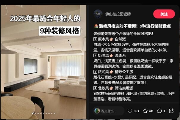 🧱 Source: @佛山柏拉图瓷砖 🏡 马来西亚2025装修趋势:原木风盛行 关键词:原木风 / 自然派 / 马来西亚2025装修 原木风在马来西亚逐年火热,强调自然与舒适感。使用白墙搭配浅木色家具,简洁温馨,兼顾美感与实用性,适合向往宁静生活的年轻群体。 🍦 奶油风来袭:马来西亚年轻人新宠 关键词:奶油风 / 温柔系装修 / 家居风格 以奶白和浅黄为主色调,搭配圆角家具,呈现出“软萌软萌”的家居气质。非常适合追求浪漫和舒适生活氛围的女生。 🖤 极简风:适合小户型马来西亚2025家装 关键词:极简风 / 小户型 / 简约装修...