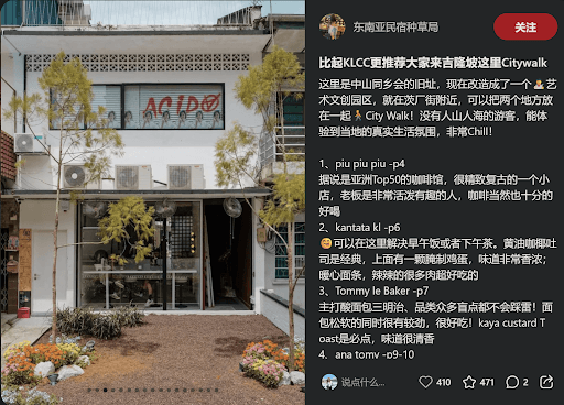 Source: @东南亚民宿种草局 KL隐藏版文创街区:Citywalk在哪? 想避开KLCC人潮、体验吉隆坡真实又Chill的城市氛围?推荐你来【Citywalk】,它其实是改造自中山同乡会旧址的文创园区,距离热门的茨厂街(Petaling Street)只需步行几分钟! 📍Citywalk是吉隆坡近年来新兴的人文艺术地标,聚集了咖啡馆、黑胶唱片店、复古服饰、文创好物,还有许多隐藏小众店等你来发掘! 🚶吉隆坡Citywalk必打卡6家特色小店推荐 1. piu piu piu(p4层) 关键词:吉隆坡咖啡店推荐 / 吉隆坡文艺咖啡馆 据说是亚洲Top 50的咖啡馆之一!复古小店风格满满,老板本身就很有个性,时常与客人互动。咖啡品质不容小觑,适合咖啡控前来深度打卡。 2. Kantata KL(p6层) 关键词:吉隆坡早午餐 / 吉隆坡下午茶推荐 这里的黄油咖椰吐司+腌蛋是经典招牌,搭配一碗暖心肉面条或香辣干拌面,都非常有满足感。适合当作早午饭或下午茶落脚点。 3. Tommy le...