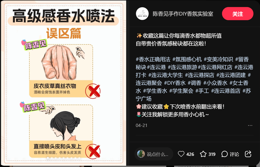 Source: @陈香见手作DIY香氛实验室 ✨ 香水喷对位置,体香翻倍! 许多人都知道喷香水,但并非人人都懂“怎么喷才高级”。2025/2026年香水趋势讲究“伪体香”与“场景感”,掌握以下喷法技巧,香水不再暴露而是悄悄迷人。 🔸 约会喷法:三步打造“撩人伪体香” 🔸 通勤喷法:香但不打扰 🚫 千万别踩的6大香水喷法雷区! 以下位置千万不要喷香水,否则可能毁衣伤肤或香味翻车: 💡 马来西亚2025/2026香氛趋势:高级香=自然香 现代人越来越追求自然与氛围感,马来西亚2025/2026的香水风格也开始趋向“有味无形”的喷香方式。掌握“位置 + 场景”双结合,才能真正打造属于你的个性体香。