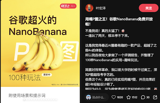 Source: @叶宏泽, 小红书 谷歌近期正式发布了一款重磅AI图像生成与编辑模型——NanoBanana,代号为Gemini 2.5 Flash Image。这款被誉为“用嘴P图之王”的工具,以其强大的功能和高效的体验,迅速在AI圈引起轰动。它不仅能将多张图像无缝融合,还能通过自然语言精确编辑图像,甚至能预测物理场景变化,如爆炸效果。 原作者是一位拥有超过五年经验的设计师,他用亲身体验证明,这款AI工具的P图效果已经可以媲美甚至超越专业设计师的水平。在当今这个图像处理需求爆炸式增长的时代,掌握像NanoBanana这样的高效AI工具,无疑是提升生产力和竞争力的关键。对于身处马来西亚、希望在2025或2026年跟上技术潮流的设计师和内容创作者来说,这绝对是不可错过的利器。 谷歌NanoBanana:AI工具的核心亮点 谷歌NanoBanana之所以被誉为“用嘴P图之王”,主要在于其三大核心功能,它们彻底颠覆了传统的图像编辑流程: 实战教程:10种高效P图玩法详解 小红书作者整理的100种玩法,覆盖了从趣味应用到专业生产力的方方面面。以下精选前10个实用案例,手把手教你如何利用这款AI工具,轻松搞定各种图像处理任务。 玩法1: 照片变3D立体手办 Prompt (提示词): “Using the nano-banana model, a 1/7 scale commercial figurine of...