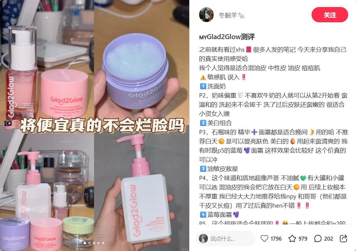 Source: @冬眠羊🐑 马来西亚护肤潮流新宠|Glad2Glow适合谁? 在 2025/2026 年的马来西亚护肤市场,Glad2Glow 已逐渐成为混油皮、痘痘肌用户中的热门选择。整体定位为平价实用型护肤品牌,主打轻盈不黏腻、修护提亮,深受中学生、小资女孩与刚入职场族群喜爱。 📌 适合肤质: Glad2Glow 全产品功能测评|4大重点组合推荐 1️⃣ 洗面奶 P2|奶香温和,清洁不拔干 2️⃣ 美白组合 P3|晚间使用效果更佳 3️⃣ P4|油敏肌救星,清爽像芦荟 4️⃣ 蓝莓面霜 P5|适合所有肤质,亮肤神器 马来西亚本地购买推荐|轻松入手 Glad2Glow 护肤品 在马来西亚寻找...