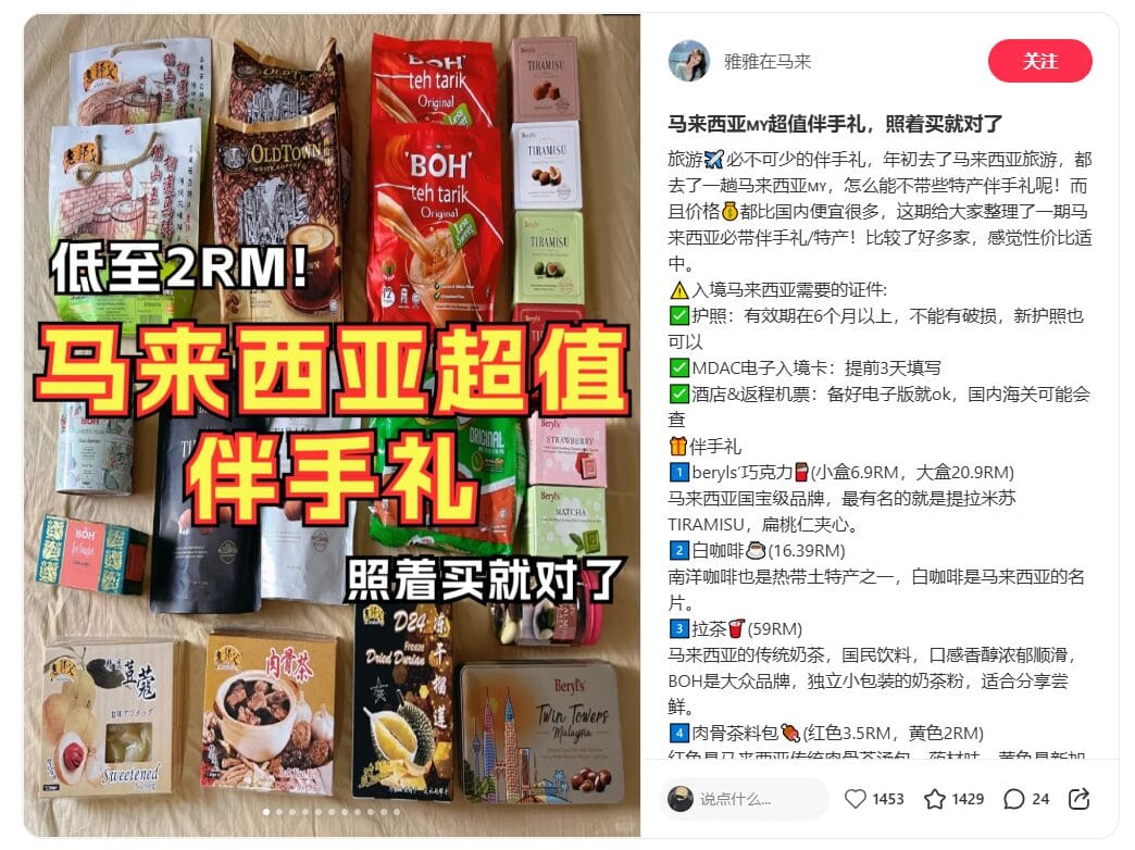 Credit: 雅雅在马来 (小红书) 无论你是第一次到马来西亚旅游,还是帮亲友代购,这份超详细的【马来西亚伴手礼清单】一定能帮到你 ✅我们从味道、口碑、实用度、价格各方面进行筛选,亲测不踩雷,还附带入境卡填写教学,照着买不出错! 🎁 热门伴手礼TOP 8推荐 1️⃣ Beryl’s 巧克力 🍫(价格:RM6.90~RM20.90) 📍推荐理由: 马来西亚国宝级品牌,机场和各大商场皆有,味道稳定、包装精美🍫 推荐口味: 🎁 适合送给:朋友、同事、学生党回国手信 2️⃣ 怡保白咖啡☕(RM16.40左右) 📍推荐品牌: OldTown、Aik Cheong、Ah Huat☕ 马来西亚标志性饮品,香浓顺滑,咖啡控一定要带! 🎁 适合送给:爸爸妈妈、上班族、早起族...