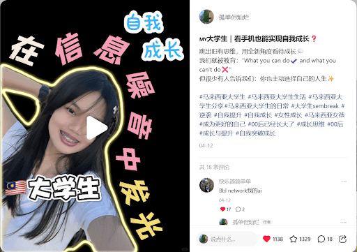 Source:@孤单但灿烂 马来西亚大学生的2025/2026成长挑战 随着时代的变化,马来西亚大学生在面对未来的过程中,已不仅仅满足于传统教育路径。尤其是在 2025/2026 期间,信息量爆炸、选择增多,成长变得复杂且不确定。 他们开始思考——除了「能做什么 vs 不能做什么」,还有没有主动定义人生的可能?这股趋势在「内容消费」中体现得尤为明显。 自我成长的起点:认知升级与批判性思维 📌 在小红书视频中,博主提到:“跳出旧有思维,全新角度看成长。”这句话精准概括了当代大学生在自我成长路上的思维转变。 📚 学会批判性思考、练习逆向思维,是很多马来西亚学生2025/2026年的核心目标。他们希望能透过看视频、读内容,获得更高层次的自我启发,而不是盲从“成功模板”。 5大必看YouTube频道推荐|2025/2026马来西亚成长资源清单 1️⃣ 后起之秀 2️⃣ BBK Network 3️⃣ Anjoe Koh 4️⃣ 大包子 5️⃣ 西西歪...