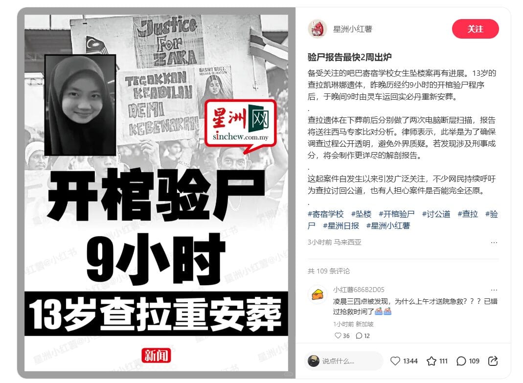 Credit : 星洲小红薯 (小红书) 📜 案件全记录:从悲剧到寻求正义的历程 ⏳ 案件时间线 2025年7月16日 2025年7月17日 2025年7月下旬 2025年8月初 2025年8月5日 2025年8月10日 🔍 案件焦点争议 证据疑点 制度问题 社会影响 🆕 最新进展 💬 用户评论精选 小红薯686B2D05 凌晨三四点被发现,为什么上午才送院急救???已错过抢救时间了 Wendy1226...