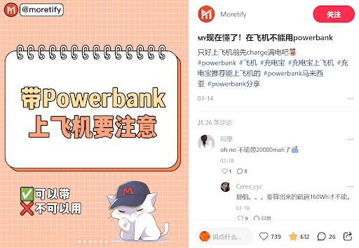 Source: @Moretify 马来西亚2025/2026 Power Bank携带规定须知 在马来西亚2025/2026,越来越多旅客喜欢携带Power bank(行动电源)随行,尤其是长途飞行时。然而,你必须留意航空公司对Power bank上飞机的明确限制,包括容量、携带方式和使用规则。掌握这些信息,不仅能避免登机受阻,更是确保飞行安全的重要一环。 Power bank不可托运,必须随身携带 托运限制与飞行安全 马来西亚及国际航空公司普遍规定,Power bank不得放入托运行李。托运时,行李舱内缺乏人员监控,一旦电池短路或起火,后果严重。因此,无论是国内或国际航班,Power bank都必须随身携带,且放在包包或口袋内,切勿放进行李托运。 Power bank容量限制:不得超过160Wh 如何计算电池容量 搭机时,Power bank的容量不得超过160Wh。若标示容量为mAh,可用以下公式换算: CopyEdit (mAh × V) ÷ 1,000 =...