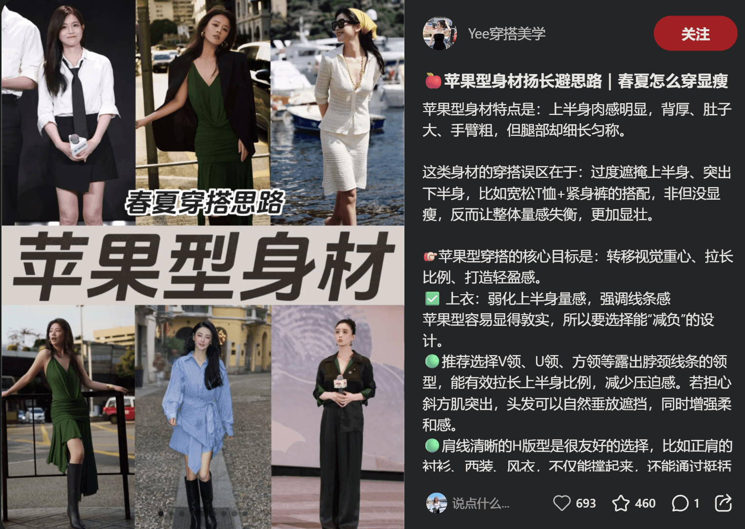Source: @Yee穿搭美学 什么是苹果型身材?|马来西亚2025/2026苹果型穿搭入门 苹果型身材的典型特征,是上半身偏肉感,尤其容易堆积在背部、手臂、胸腹,而下半身多半修长匀称。许多马来西亚女性因热带气候常穿轻薄衣物,更容易让苹果型身材的上半身体积感暴露无遗。 因此,2025/2026年在马来西亚,苹果型穿搭不再是单纯“遮肉”,而是通过弱化上半身量感、打造线条感与拉长身材比例,实现显瘦与时尚兼顾。 苹果型穿搭核心目标:转移视觉重心,显瘦又时髦 苹果型身材想显瘦,绝不能盲目宽松。若上宽下紧,反而会让上半身显得更厚重,造成视觉失衡。穿搭核心在于: ✅ 上半身 → 弱化量感,选线条简洁、剪裁俐落的设计✅ 下半身 → 强调腿部优势,保持适度存在感✅ 整体 → 转移视觉重心,营造轻盈感 上半身穿搭技巧|V领、U领、方领是苹果型的救星 马来西亚2025/2026苹果型穿搭趋势,强调颈部线条的露出。 🟢 推荐领型: 🟢 推荐单品: 下半身穿搭推荐|A字裙、直筒裤、微喇裤 苹果型身材虽然上半身较壮,但拥有纤细的腿部优势。马来西亚常年高温,适合轻盈又有质感的下装。 🟢...