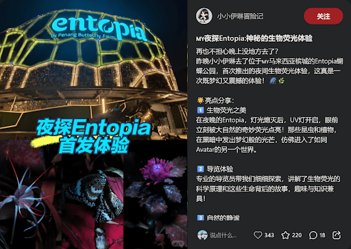 Source: @小小伊琳冒险记 为什么马来西亚2025/2026必去Entopia夜探荧光体验? 马来西亚槟城一直是热门旅游地,而Entopia蝴蝶公园更是许多游客的必访景点。如今,这里推出了全新项目:夜探生物荧光体验,为马来西亚2025/2026旅游注入全新惊喜。 ✅ 完全不同于白天的蝴蝶公园体验✅ 在黑暗中探索神秘生物的荧光之美✅ 兼具科普与视觉享受 对喜爱大自然、摄影或猎奇体验的游客来说,这趟夜游绝对不容错过。 Entopia夜探荧光体验亮点揭秘 以下内容根据 @小小伊琳冒险记 分享的亲身体验整理而成。 生物荧光之美,宛如Avatar世界 夜晚的Entopia,一切灯光熄灭,UV灯悄然亮起: 这种视觉冲击是白天绝对看不到的,马来西亚2025/2026绝对要安排进行程里! 专业导览,知识与趣味兼具 夜探Entopia不仅是视觉盛宴,更是一堂生动的自然课: ✅ 专业导览员带领探索✅ 讲解生物荧光的科学原理✅ 分享许多昆虫、植物背后的趣味故事 不仅孩子喜欢,大人也能学到不少新知。 自然的静谧与心灵治愈 夜晚的Entopia,有别于白天的热闹: 在马来西亚2025/2026的快节奏生活中,这样的体验尤其珍贵。...