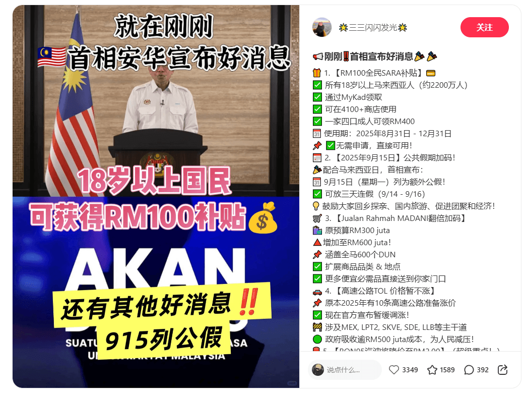Credit: 🌟三三闪闪发光🌟 (小红书) 📢刚刚‼️马来西亚首相亲自宣布2025年8项重磅好消息🎉 🎉 快收藏!全马人民都能受惠👇👇 🎁 1. RM100全民SARA补贴 ✅ 所有18岁以上马来西亚人(约2200万人)✅ 通过MyKad自动发放,无需申请✅ 可在4100+家商店直接使用✅ 一家四口可共领RM400🗓️ 使用期:2025年8月31日至12月31日 💡 如何知道有没有领到? — 只需8月31日后,带上MyKad去消费就能验证! 📅 2. 2025年9月15日额外公共假期! 🗓️ 9月15日(星期一)列为马来西亚日特别公假✅ 可享三天连休(9月14-16)💡 鼓励国人回乡、团聚、国内旅游!...