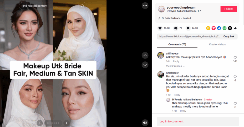 Gaya ini sangat sesuai untuk majlis berinai, resepsi malam, atau sesi fotografi di bawah pencahayaan lembut. Untuk pengantin berkulit cerah hingga sawo matang, solekan Thai membantu menonjolkan ekspresi wajah tanpa perlu warna yang terlalu pekat.