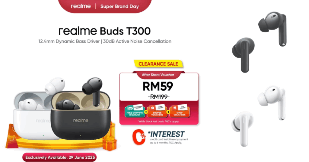 If you want something cheap that doesn’t skimp on quality, the realme Buds T300 is the best option. These headphones are less than RM200 and include features that are just as good as those of more expensive brands. They provide 30dB Active Noise Cancellation, a 50ms low-latency gaming mode, and a 360° Spatial Audio experience, which is why students and casual gamers love them.