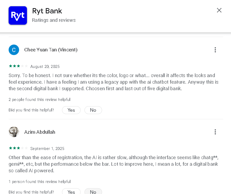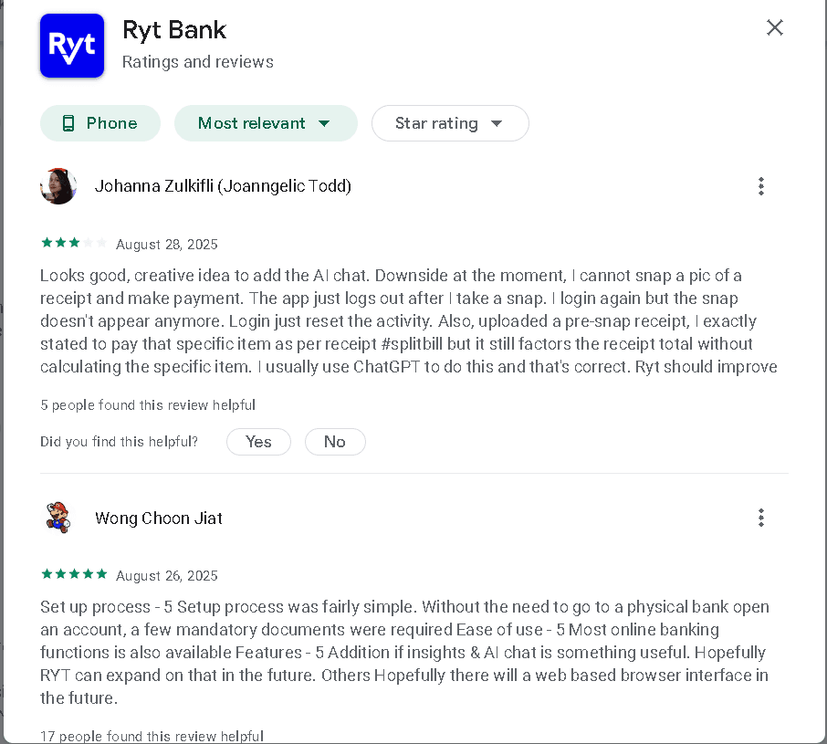 The reviews for Ryt Bank reveal a mix of positive and negative feedback. Users appreciate the simple setup process and the AI chat feature, with some finding it useful for online banking tasks. However, several issues are highlighted, particularly with the app’s design, which some users find outdated or unappealing. There are also complaints about the app’s performance, especially with the AI, which users feel is slow and inaccurate, particularly in tasks like splitting bills and snapping receipts. Despite the promising features, users suggest improvements in both functionality and design to enhance the overall user experience.