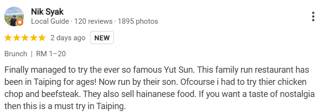 Nik Syak mentioned, “Finally managed to try the ever so famous Yut Sun. This family-run restaurant has been in Taiping for ages and is now run by their son. Of course, I had to try their chicken chop and beefsteak. They also serve Hainanese food. If you want a taste of nostalgia, then this is a must-try in Taiping.”