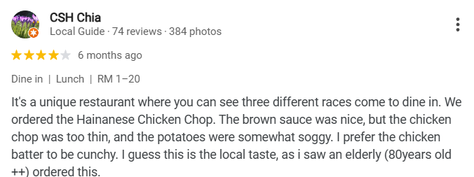 CSH Chia shared, “It’s a unique restaurant where you can see three different races come to dine in. We ordered the Hainanese Chicken Chop. The brown sauce was nice, but the chicken chop was a bit too thin, and the potatoes were somewhat soggy. I prefer the chicken batter to be crunchy. I guess this is the local taste, as I saw an elderly person (80+ years old) order this.”