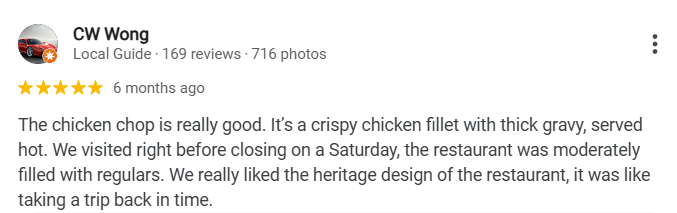 CW Wong commented, “The chicken chop is really good. It’s a crispy chicken fillet with thick gravy, served hot. We visited right before closing on a Saturday, and the restaurant was moderately filled with regulars. We really liked the heritage design of the restaurant; it felt like taking a trip back in time.”
