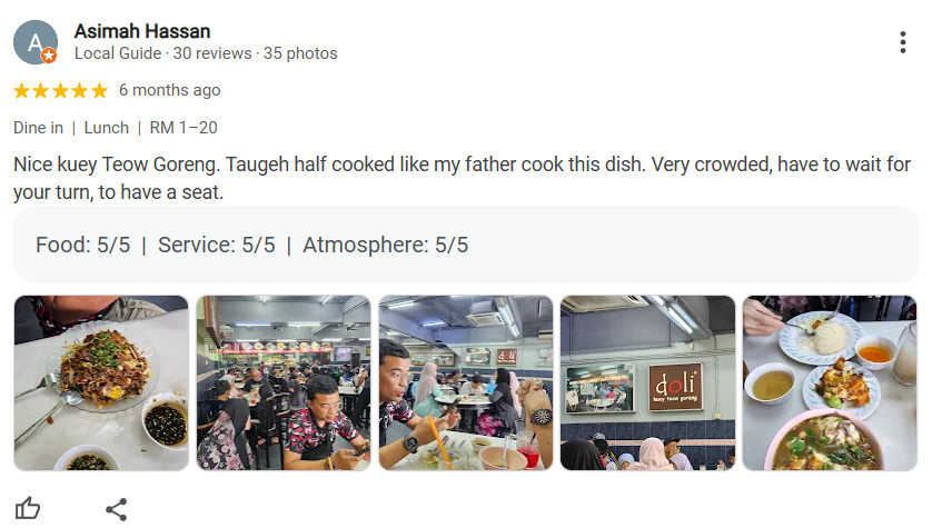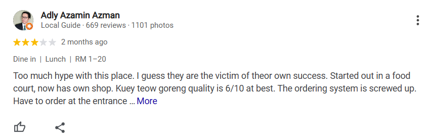 Adly Azamin Azman commented, “There’s too much hype around this place. I guess they’ve become a victim of their own success. They started out in a food court and now have their own shop. The Kuey Teow Goreng quality is 6/10 at best. The ordering system is a bit messed up—you have to order at the entrance before booking a seat. Sometimes no one is at the front, and the queue gets longer. On the positive side, the food is quite affordable, except for the Kuey Teow Goreng Special, which is RM18 per plate.”