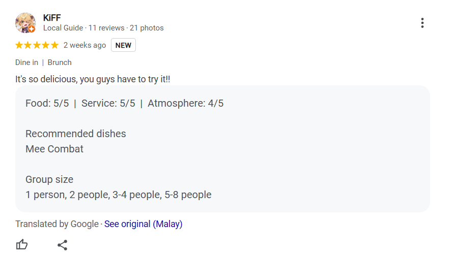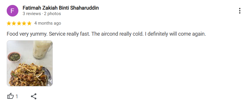 Fatimah Zakiah Binti Shaharuddin shared, “The food is very yummy, and the service is really fast. The air conditioning is really cold, which is a nice touch. I will definitely come again.”