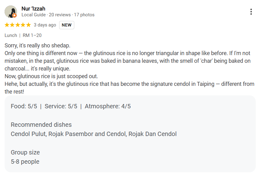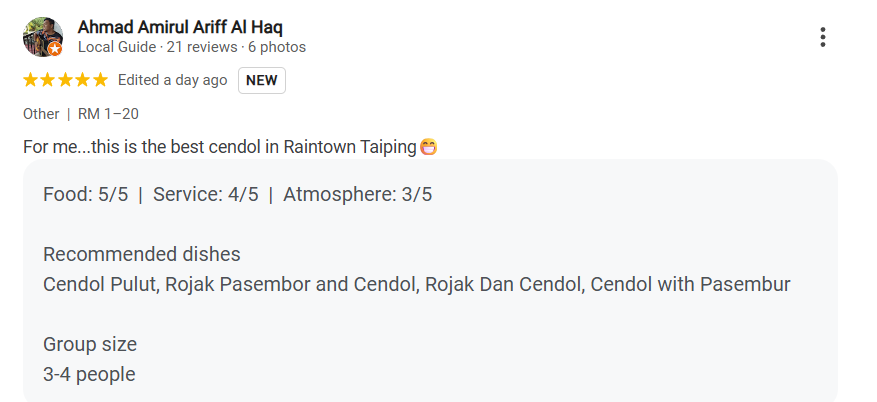 Ahmad Amirul Ariff Al Haq mentioned, “For me, this is the best Cendol in Raintown Taiping 😁. It’s definitely a must-try, and I’ll be coming back for more!”
