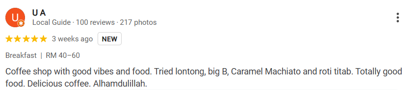 U A mentioned, “A coffee shop with good vibes and food. I tried Lontong, Big B, Caramel Macchiato, and Roti Titab. Totally good food and delicious coffee. Alhamdulillah.”