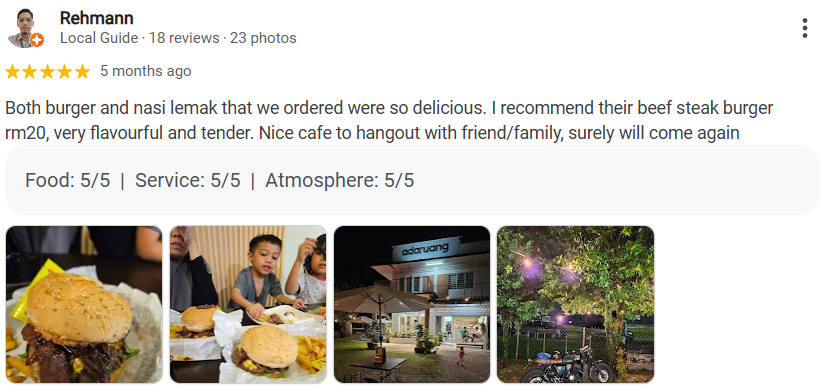 Rehmann commented, “Both the burger and Nasi Lemak we ordered were so delicious. I recommend their beef steak burger, RM20, very flavorful and tender. A nice café to hang out with friends/family, I’ll definitely come again.”