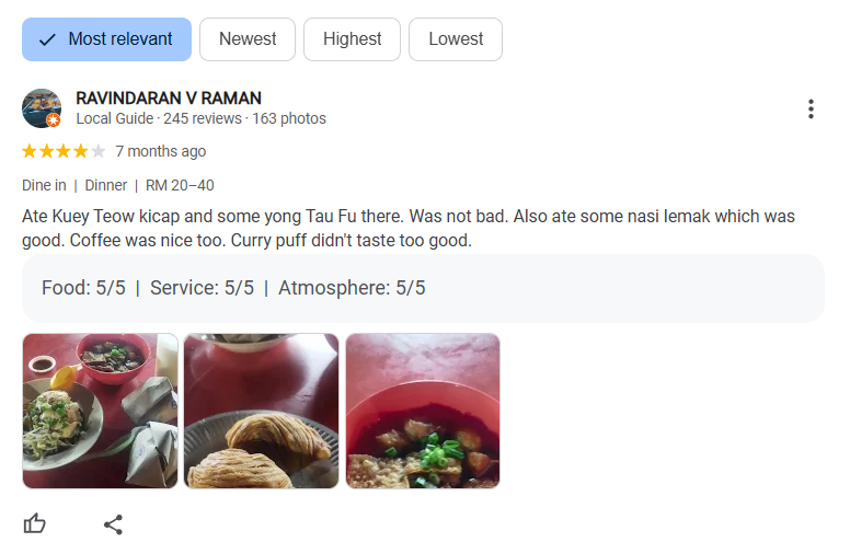 Ravindaran shared that he had tried Kuey Teow Kicap, Yong Tau Fu, and Nasi Lemak, all of which were enjoyable. The coffee was also praised. However, he was not satisfied with the curry puff, which he felt didn’t meet expectations.