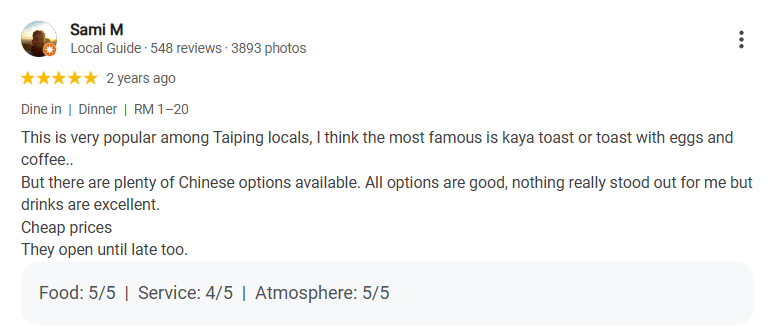 Sami recommended the Kaya Toast or toast with eggs and coffee as the most famous items at the café, widely enjoyed by Taiping locals. They also mentioned the availability of many Chinese food options, though nothing in particular stood out for them. The drinks were described as excellent, and the prices were deemed very affordable. Additionally, the café is open late.