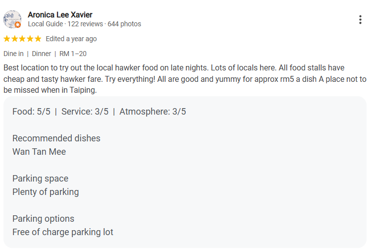 Aronica described the location as the best spot for late-night hawker food, with plenty of locals frequenting it. They found the food stalls offered cheap and tasty dishes, recommending that visitors try everything on the menu. The dishes are priced at about RM5, making it an affordable option in Taiping.