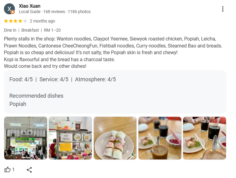 Xiao Xuan shares that the food court has a wide variety of food stalls offering dishes like Wanton noodles, Claypot Yeemee, Siewyok roasted chicken, Popiah, and many more. They specifically highlight the Popiah for being delicious and affordable, with fresh and chewy skin. Additionally, the Kopi (coffee) is flavorful, and the bread has a nice charcoal taste. Xiao Xuan expresses an interest in returning to try other dishes.