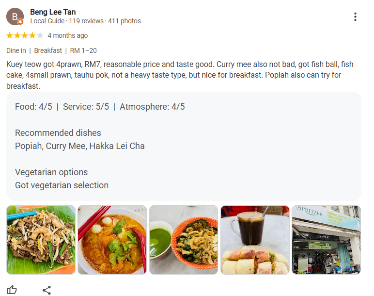Beng Lee Tan mentions that the Kuey Teow (fried flat noodles) with prawns for RM7 is very reasonably priced and tasty. They also enjoyed the Curry Mee, which included fish ball, fish cake, small prawns, and tauhu pok, describing it as not too heavy but perfect for breakfast. Popiah is also recommended for breakfast.