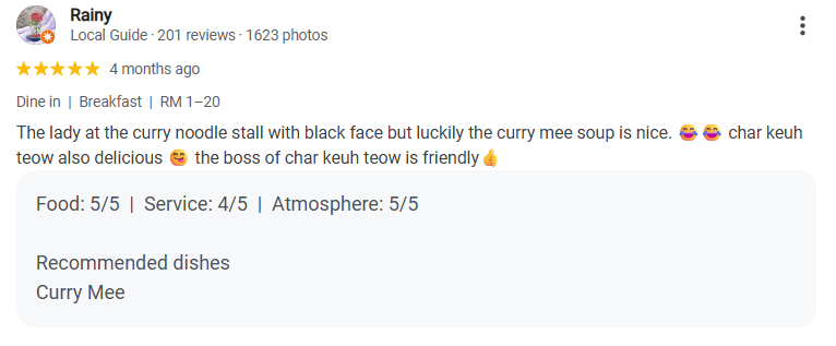Rainy humorously describes their experience with a vendor at the curry noodle stall, joking about the vendor’s “black face” but still complimenting the Curry Mee soup, which was delicious. They also mention enjoying the Char Keuh Teow (fried flat noodles) and note the friendly service from the stall owner.
