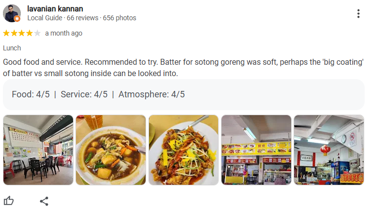 Lavanian shared that the food and service were good, recommending the restaurant. However, they pointed out that the batter for the Sotong Goreng (fried squid) was soft. They suggested that the proportion of the batter to the small squid inside could be improved, as the batter seemed to have a larger coating compared to the size of the squid.