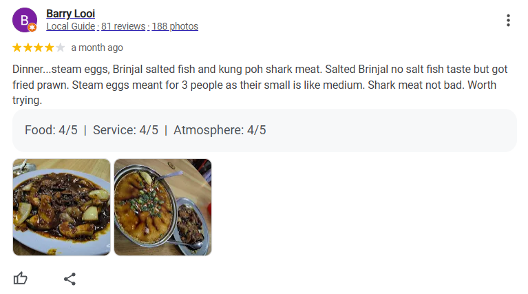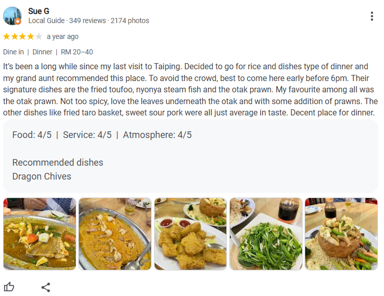 Sue gave a positive review, particularly recommending the otak prawn, while offering constructive feedback about some of the other dishes. She praised the ambiance, food, and service, giving the restaurant a solid rating of 4/5.