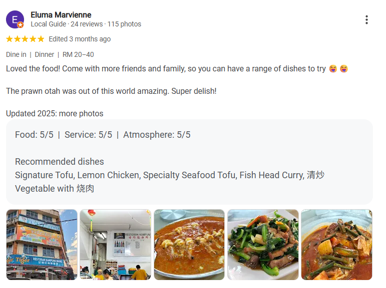Eluma thoroughly enjoyed the food, particularly praising the Prawn Otah, calling it “out of this world” and “super delish.” They recommended visiting with friends or family so you can try a wider variety of dishes. Some of the dishes they enjoyed included Signature Tofu, Lemon Chicken, Specialty Seafood Tofu, and Fish Head Curry.
