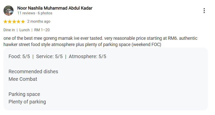 Noor Nashila Muhammad Abdul Kadar mentioned, “One of the best Mee Goreng Mamak I’ve ever tasted. Very reasonable price starting at RM6. The authentic hawker street food atmosphere adds to the charm, plus there’s plenty of parking space (weekend FOC).”