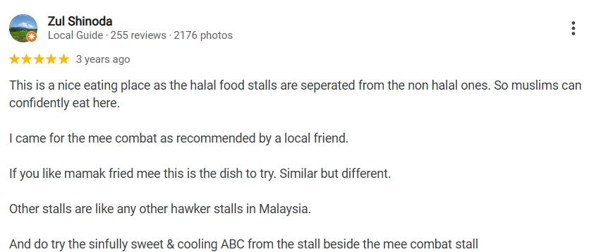 Zul Shinoda shared, “This is a nice eating place as the halal food stalls are separated from the non-halal ones, so Muslims can confidently eat here. I came for the Mee Combat, as recommended by a local friend. If you like mamak fried mee, this is the dish to try—similar but different. Other stalls are like any other hawker stalls in Malaysia, but do try the sinfully sweet and cooling ABC from the stall beside the Mee Combat stall. It’s a great combo!”
