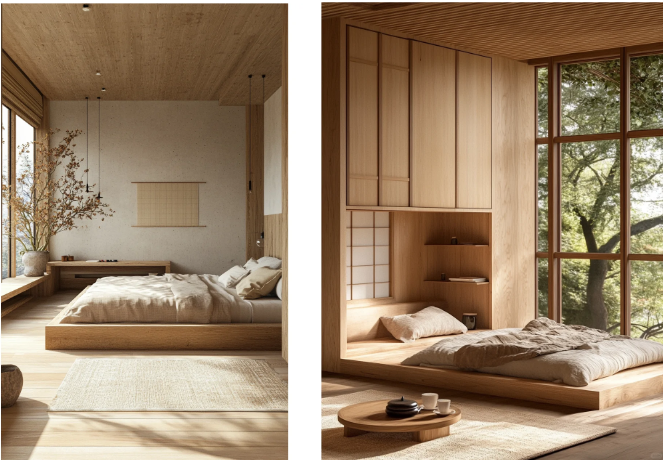 💡 Minimalist aesthetic, low-profile beds, soft lighting, neutral tones, and Zen decor.