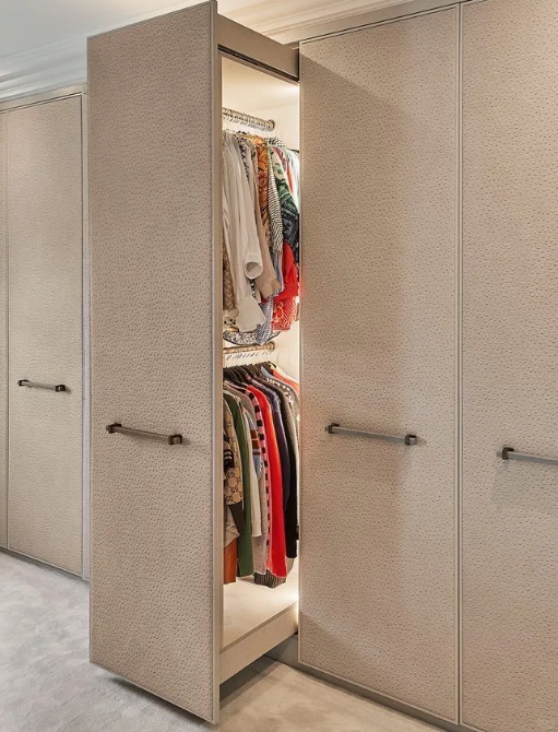 - Rotating shelves to maximize accessibility in small bedroom spaces.